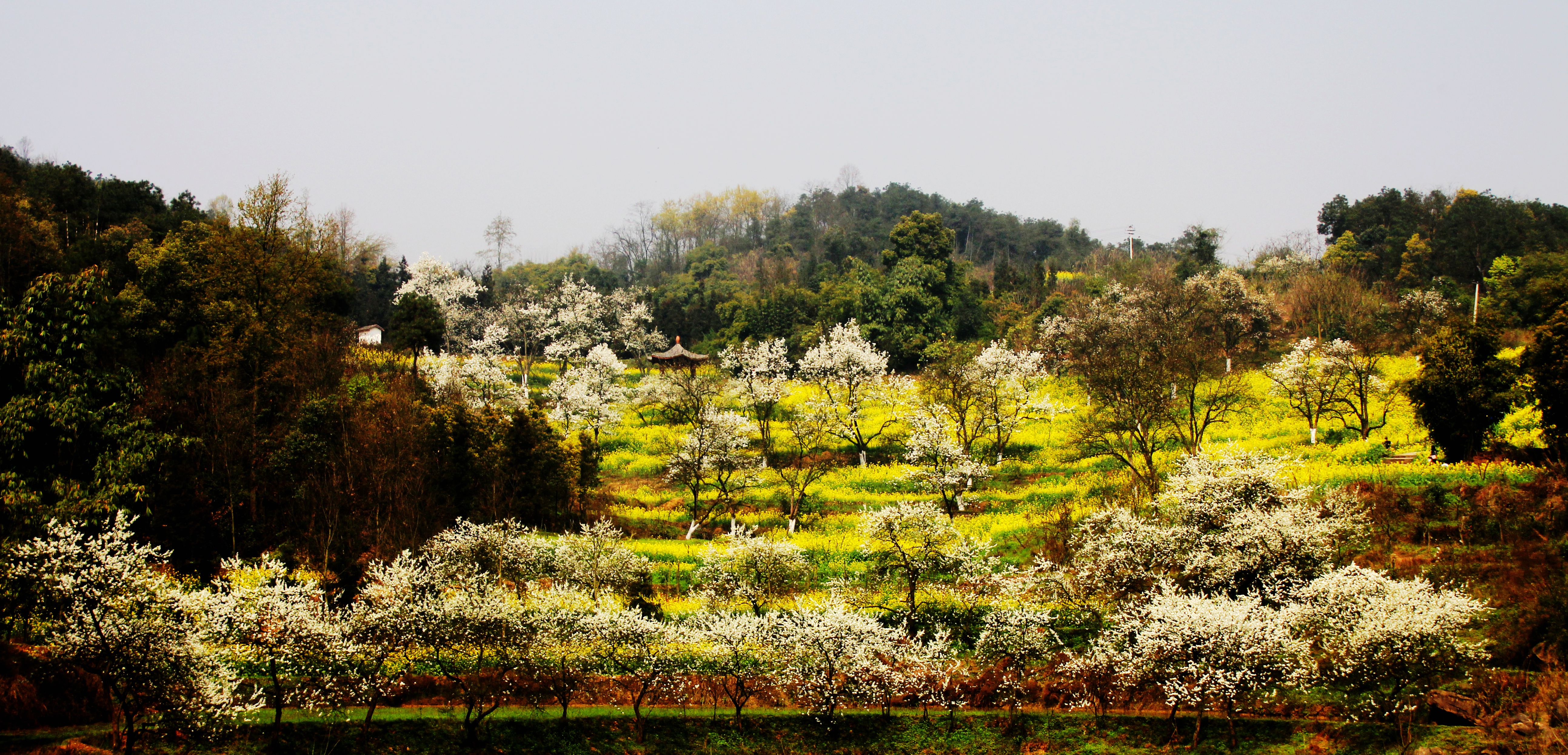 梨花飘雪:正值盛花期,微风吹过,白雪皑皑的梨花花瓣飘散在空中,好似雪花,甚是漂亮。